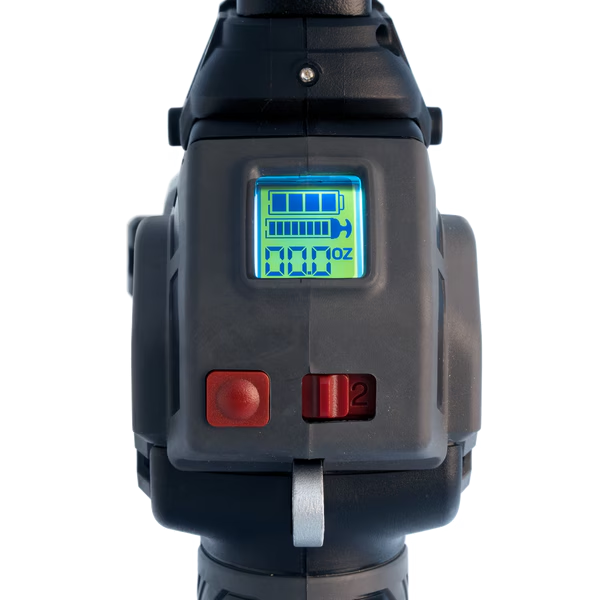 - Display indicates lithium battery charge level and remaining grease level